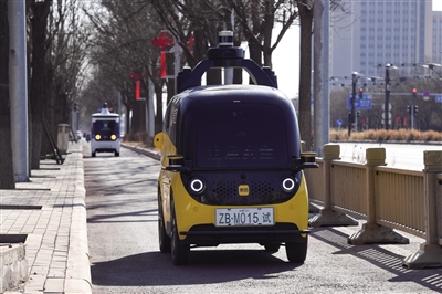 图为两辆无人车正在北京经济技术开发区街头行驶。 新华社记者 鞠焕宗 摄